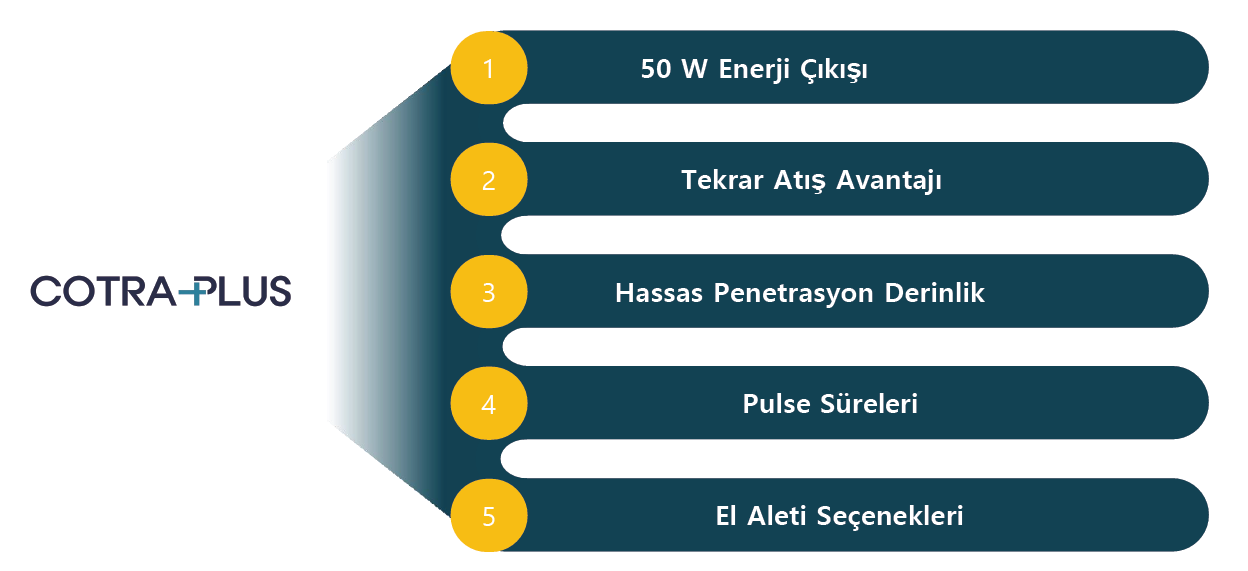 COTRA PLUS, 50W çıkış gücü, hassas penetrasyon kontrolü, ergonomik tasarımı ve hava soğutmalı sistemiyle hem etkili hem de güvenli tedaviler vadeder. İyi huylu cilt lezyonlarından cilt gençleştirmeye, vajinal sıkılaştırmadan pigmentli lezyon tedavilerine kadar geniş bir endikasyon yelpazesinde kullanılan cihaz, kliniklerin teknolojiye dayalı prestijini artırırken, hastalara da memnuniyet verici sonuçlar sunar.